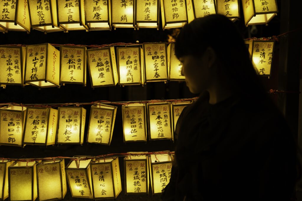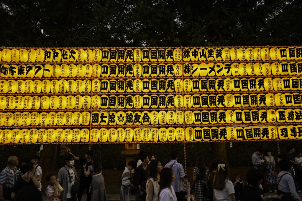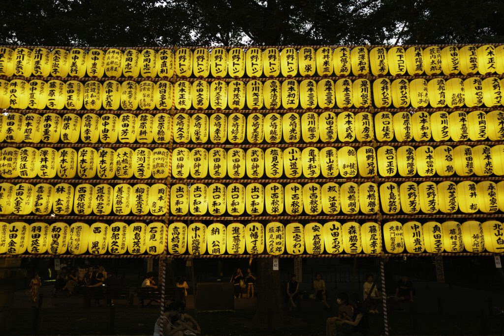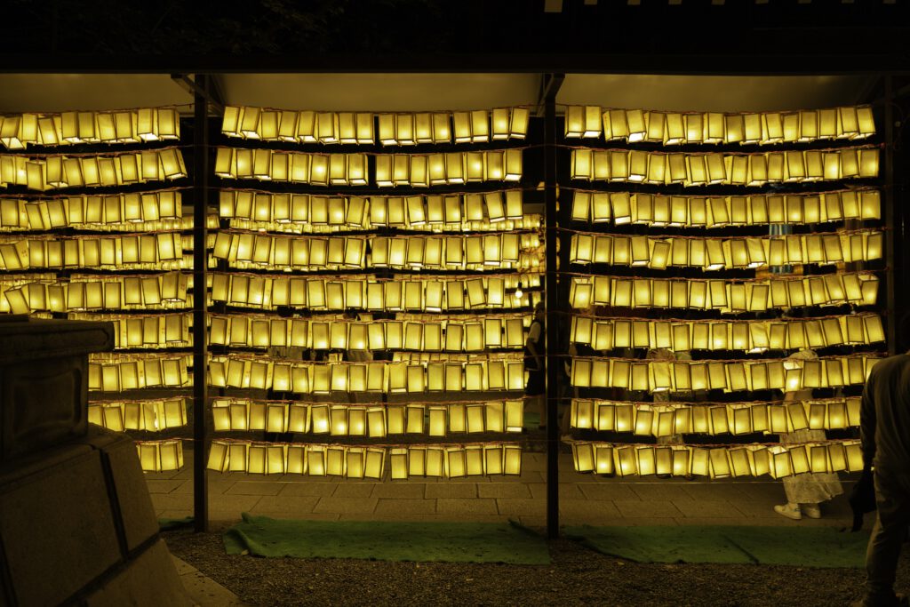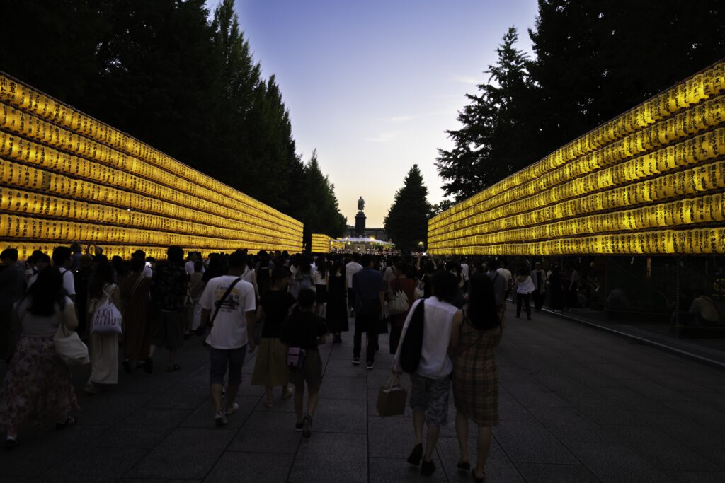 Die Nächte erwachen im sanften Schein von mehr als 30 000 Votiv- und Papierlaternen zum Leben, jede eine stille Ode an die in ihr verewigten Seelen. Die mit komplizierten Inschriften und Kunstwerken verzierten Laternen üben einen magischen Zauber aus und verwandeln das Gelände des Schreins in ein faszinierendes Spektakel aus Licht, Respekt und Erinnerung.