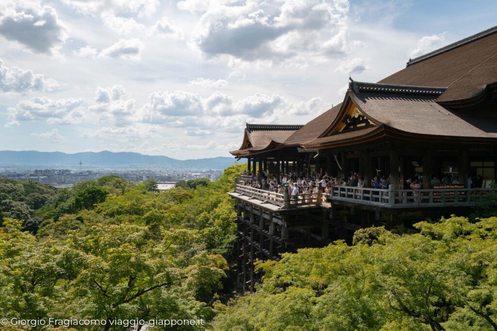 ユネスコ世界遺産「古都京都の文化財」(https://www.viaggio-giappone.it/kiyomizu-dera-tempio/)に登録されている清水寺は、小高い丘の中腹にあり、京都市街を一望できる。本堂から突き出た木造の舞台は崖の上にあり、四季折々のドラマチックな景色が楽しめる。